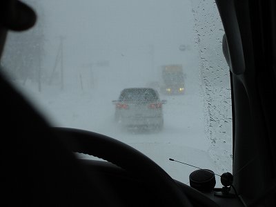 ・初日は、お隣山形県の「亀岡文殊」へ次男坊の合格祈願に R13栗子峠は吹雪! もう少し酷くなるとホワイトアウトで走行すらも危険です。 前走車のテールランプが頼り |