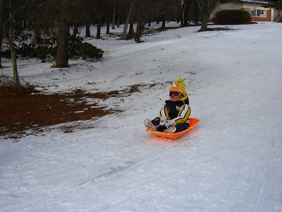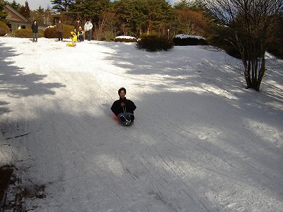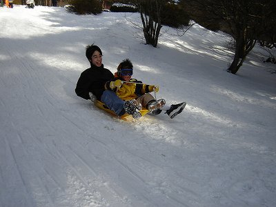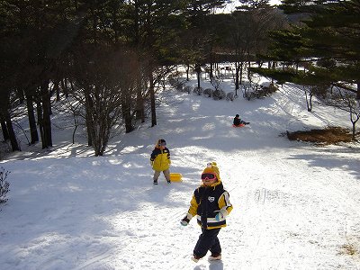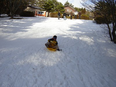・妹一家と合流後、3時のチェックインまで時間があったので、近くでソリ滑り。 例の甥っ子(さる2号)と姪っ子です。 |