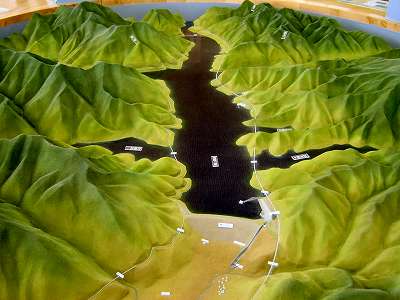・ダム湖周辺の模型です。 昔、釣りに入った沢などは、全て水没してしまいました・・・ ダムが出来て2〜3年すると、岩魚などは巨大化するので 楽しみにしてましたが、水質保全の為に、釣り・ボート・湖水浴は 全面禁止にするらしいです。 残念! |