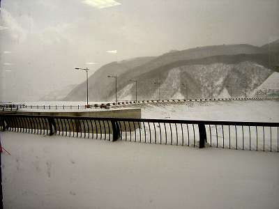 ・続いて、ダム下流にある「もにわの湯」へむかいます。 白い土手の様な物がダムの堤体。 白黒画像ではありません! まさに白と黒の世界です。 |