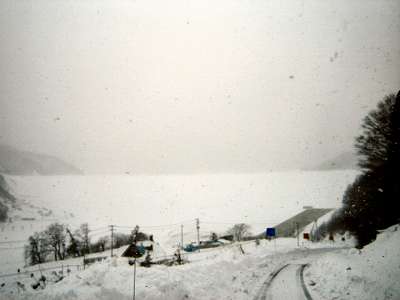 ・ダム湖側から堤体を望む。 雪が邪魔で下が見えません(-.-) |